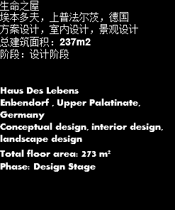 生命之屋 埃本多夫,上普法尔茨,德国 方案设计,室内设计,景观设计 总建筑面积:237m2 阶段:设计阶段 Haus Des Lebens Enbendorf , Upper Palatinate, Germany Conceptual design, interior design, landscape design Total floor area: 273 m² Phase: Design Stage